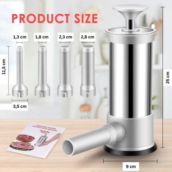 Questo insaccatore comprende quattro beccucci in PP con diametri diversi: 1,3 cm. 1,8 cm, 2,3 cm e 2,8 cm.